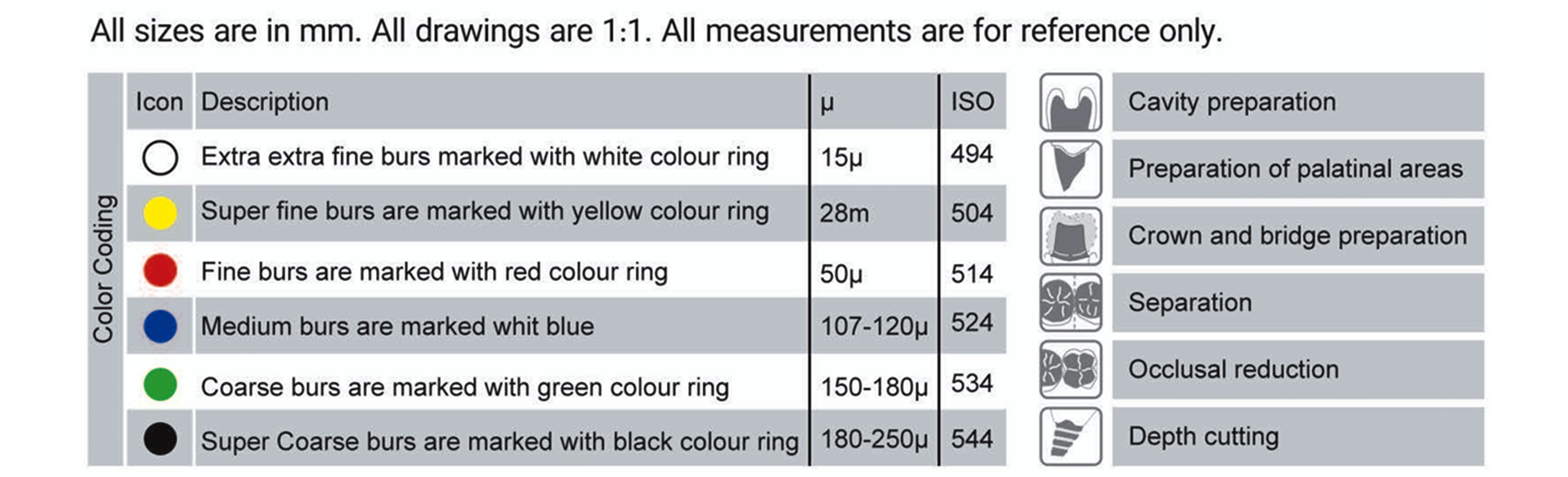 میزان زبری فرز دندانپزشکی با رنگ مخصوصی در دور گردن فرز مشخص می شود. رنگ بندی فرزهای مخصوص توربین دندانپزشکی شامل سیاه، سبز، آبی، قرمز و زرد هستند که میزان زبری آن ها به ترتیب از بیشترین به کمترین تقسیم بندی شده اند. معمولا فرزهای دور سبز و دور آبی برای تراش دندان ها مورد استفاده قرار می گیرند و از فرزهای دور زرد برای ترمیم های کامپوزیتی استفاده می شود.